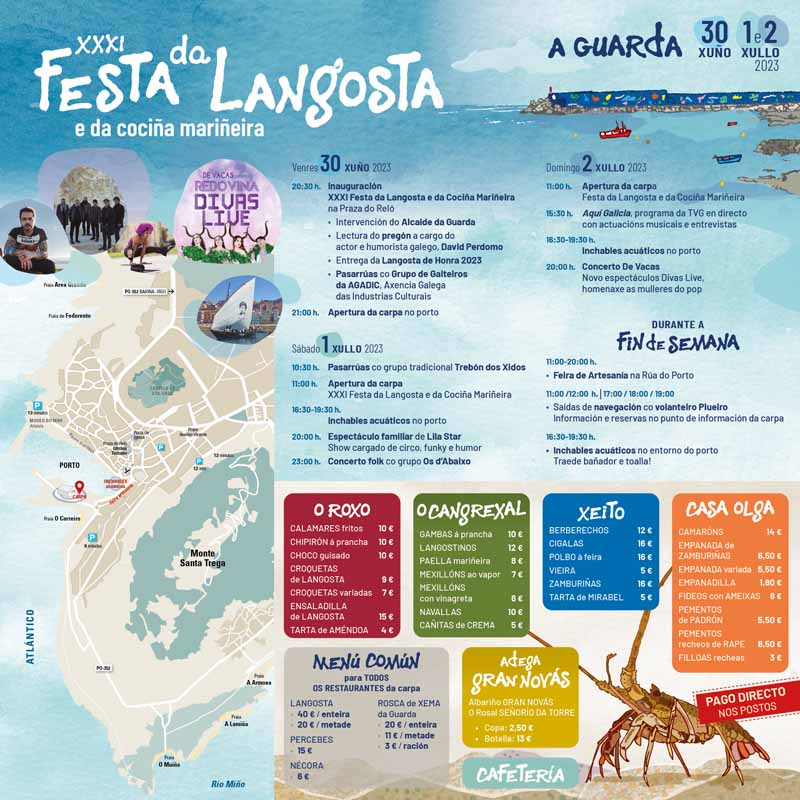 Después de anunciar la próxima celebración de la XXXI edición de la “Fiesta de la Langosta y de la Cocina Marinera” para el fin de semana del 30 junio al 2 de julio, el Ayuntamiento de A Guarda acaba de desvelar el programa actividades que tiene preparado, con entretenimiento para todos, mayores e pequeños, que se desarrollará a lo largo de los tres días en los que tiene lugar esta fiesta.