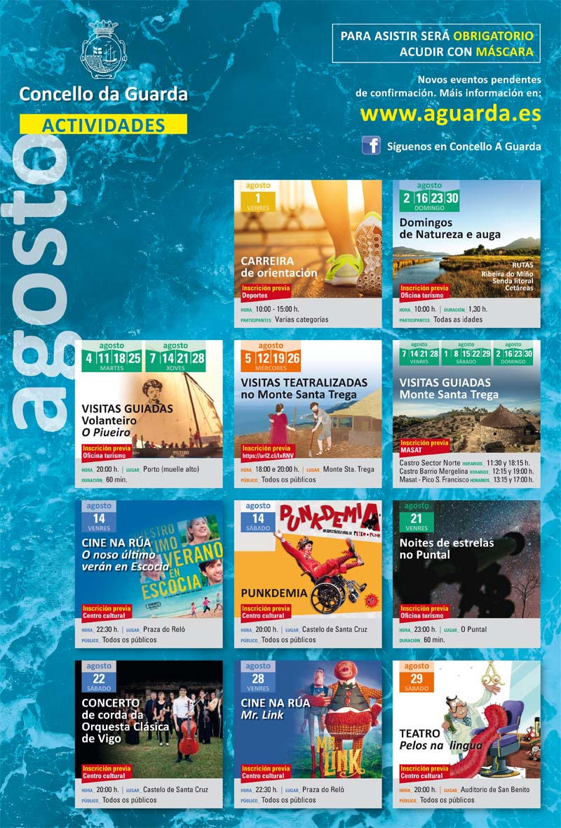 El Ayuntamiento de A Guarda continúa esta semana con el calendario de actividades recogido en la Agenda de Verano 2020 y en la que aparecen reflejadas todas las propuestas culturales, formativas, turísticas, deportivas y de ocio que están a disposición de toda la ciudadanía guardesa y visitantes a lo largo de los meses de verano.