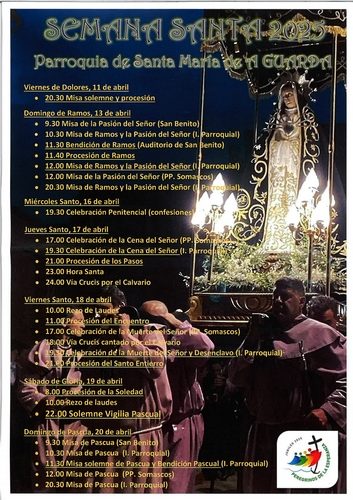 El Jueves Santo vendrá marcado por la «Procesión de los Pasos», con salida a las 21:00 horas desde la Iglesia Parroquial de Santa María. El Viernes Santo tendrán lugar, desde el mismo punto, la «Procesión del Encuentro» (11:00 h) y la «Procesión del Santo Entierro» (21:00 h). Los actos religiosos cerrarán con la misa solemne de Pascua y la bendición pascual, el domingo 20 a las 11:30h.