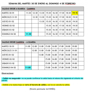 Esta semana las salidas del ferry se verán afectadas por la marea baja. Por lo tanto, se adjunta la tabla con los horarios definitivos hasta el domingo 4 de febrero con las salidas confirmadas y aquellas que sufren alguna variación están marcadas.