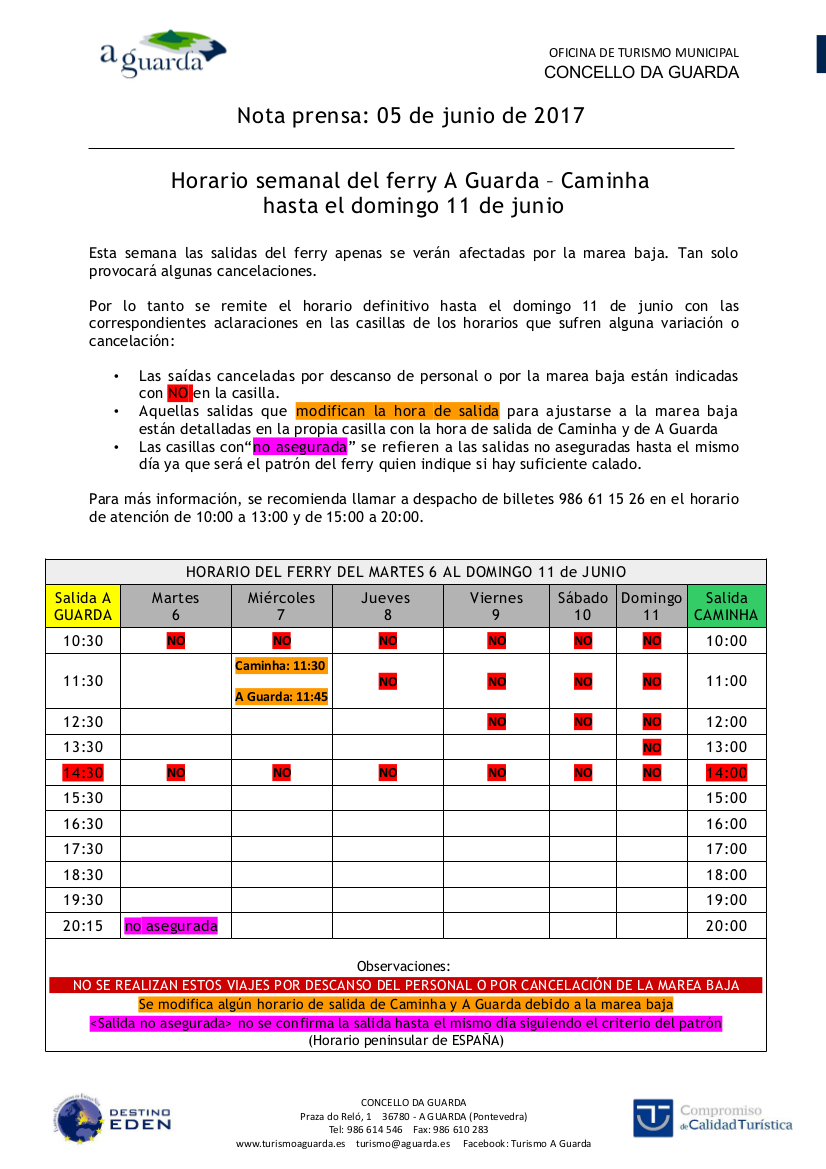 Aquellas salidas que modifican la hora de salida para ajustarse a la marea baja están detalladas en la propia casilla con la hora de salida de Caminha y de A Guarda