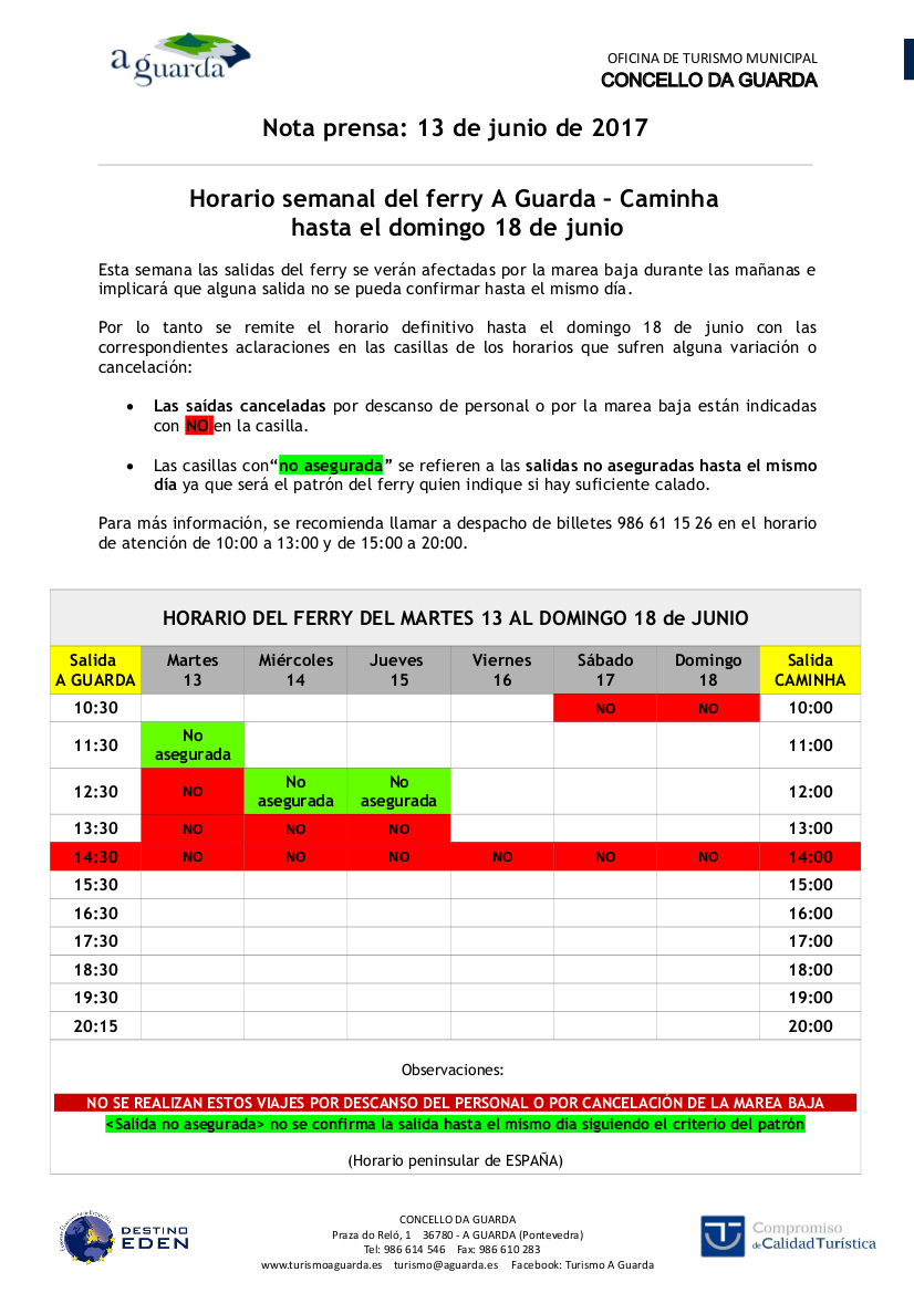 Las casillas con“no asegurada” se refieren a las salidas no aseguradas hasta el mismo día ya que será el patrón del ferry quien indique si hay suficiente calado.
