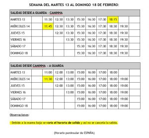 Esta semana las salidas del ferry se verán afectadas por la marea baja. Por lo tanto, se adjunta la tabla con los horarios definitivos hasta el domingo 18 de febrero con las salidas confirmadas y aquellas que sufren alguna variación están marcadas.