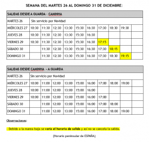 Esta semana las salidas del ferry se verán afectadas por la marea baja. Por lo tanto, se adjunta la tabla con los horarios definitivos hasta el domingo 31 de diciembre con las salidas confirmadas y aquellas que sufren alguna variación están marcadas. Durante esta semana, el servicio será gratuito, según anunció el Minicípio de Caminha Leer más