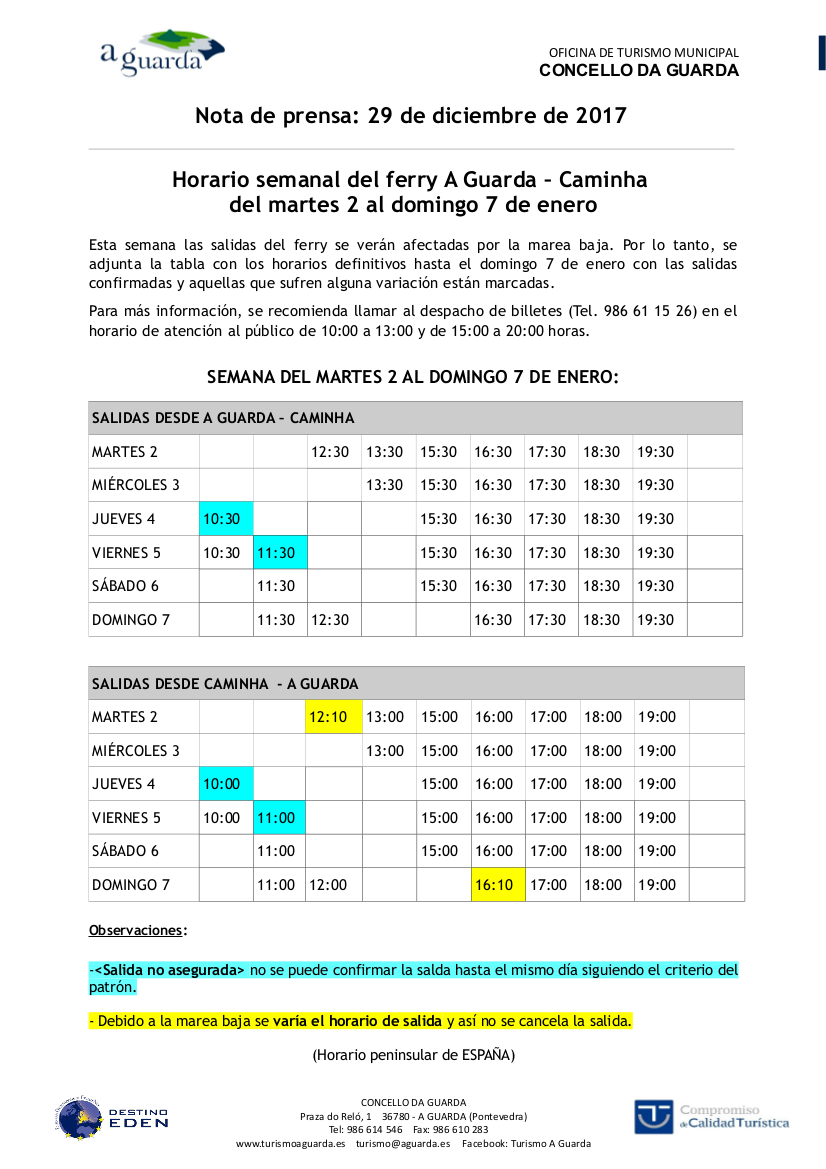 Nuevamente esta semana las salidas del ferry se verán afectadas por la marea baja. Por lo tanto, se adjunta la tabla con los horarios definitivos hasta el domingo 7 de enero con las salidas confirmadas y aquellas que sufren alguna variación están marcadas. Para más información, se recomienda llamar al despacho de billetes (Tel. 986 61 15 26) en el horario de atención al público de 10:00 a 13:00 y de 15:00 a 20:00 horas.