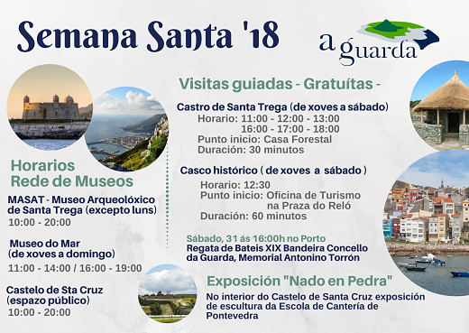 A Guarda celebrará la Semana Santa de 2018 con un amplio programa de activicades culturales para disfrute de la vecindad y los visitantes. Destacan las tradicionales procesiones, así como la oferta de visitas guiadas gratuítas para conocer la historia y el patrimonio de nuestro pueblo.