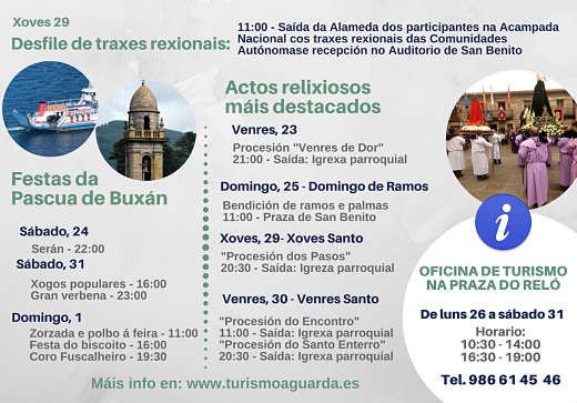 La Oficina Municipal de Turismo, situada en la Praza do Reló, abrirá desde el lunes 26 hasta el sábado 31 de marzo con un horario ampliado, a saber, de 10:30 a 14:00 horas y de 16:30 a 19:00 horas. Para más información, las personas interesadas podrán acercarse hasta la oficina, contactar con el departamento de Turismo en el teléfono 986 614 546 y/o a través del correo electrónico turismo@aguarda.es, o bien consultar la página de Facebook de Turismo A Guarda.